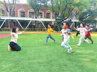 在创建儿童友好幼儿园的过程中,中共湖南省委机关新湘幼儿院注重友好文化建设,着力构建幸福友好的家园社关系、师幼关系等。图为该院教师陈瑶瑶和孩子们在一起游戏。 杨炀 摄