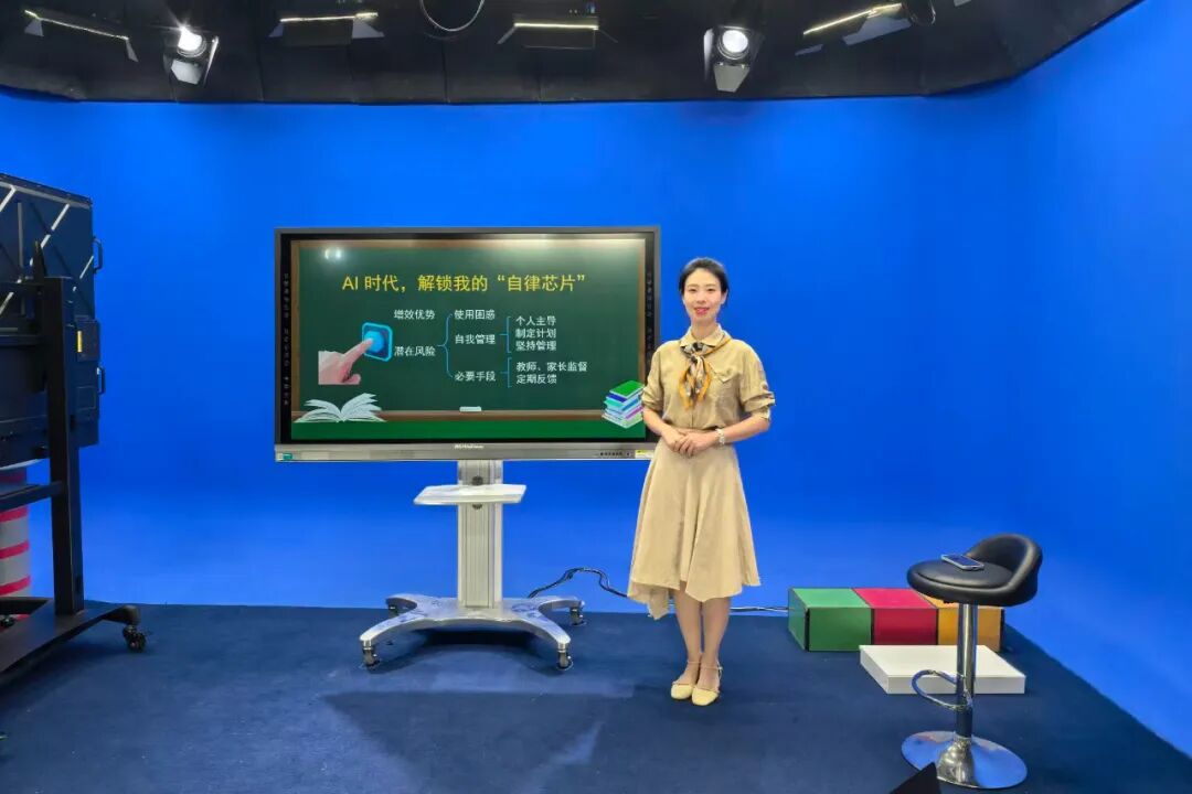 学校教师设计组织的“智脑PK赛”,让学生对AI解题与自主解题的结果进行对比,亲身感受独立思考的价值;老师通过记录时长,引导学生感受动脑处理难题时,随着练习次数的增加,解题时间在不断缩短;学生在过程中感受到克服困难后的欣喜,也体验到动脑思考的魅力,更让他们在与AI的互动中,学会了如何在AI时代保持独立思考的能力。北京市京源学校教师在录制AI相关内容的主题班会。