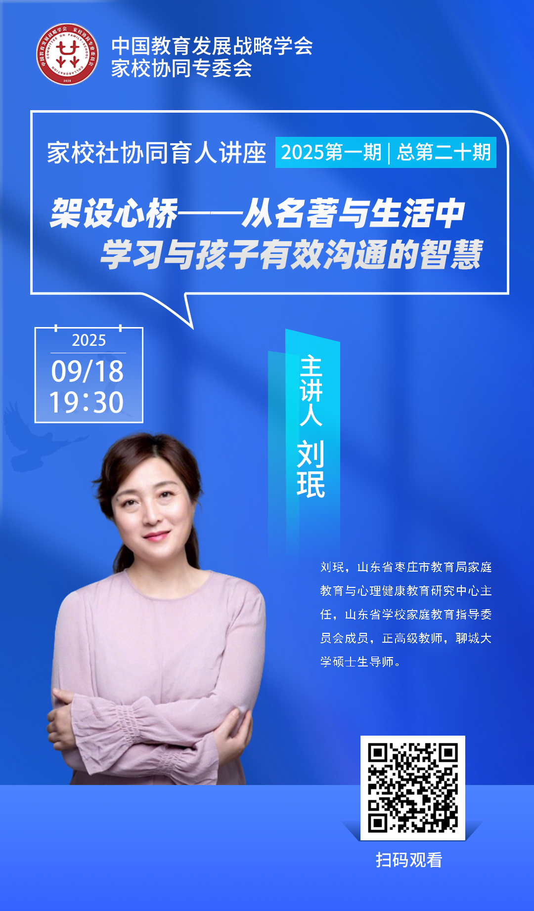 - 直播嘉宾:刘珉(山东省枣庄市教育局家庭教育与心理健康教育研究中心主任、山东省学校家庭教育指导委员会成员、正高级教师、聊城大学硕士生导师)